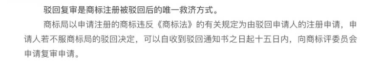 申請(qǐng)人可以在收到駁回通知書、裁定通知書或撤銷通知書之日起十五天內(nèi)向商標(biāo)評(píng)審委員會(huì)請(qǐng)求復(fù)審。